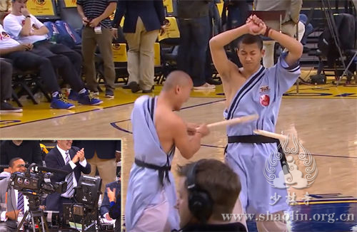 当天下午,为庆祝中国新年,在美国NBA金州勇士队与洛杉矶快船队的赛事中,主办方特意举办中国农历新年庆祝活动,延然师父率领30多人师生团队展示的精彩少林拳术、传统兵器和硬气功节目,震撼了全场观众,ESPN体育评论员从椅子蹦起来鼓掌叫好,惊叹这是有史以来最棒的助赛表演。