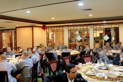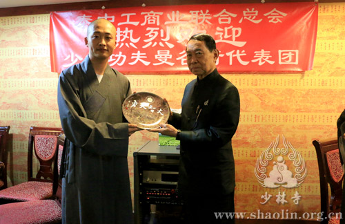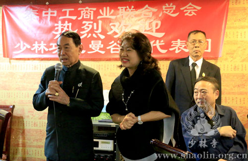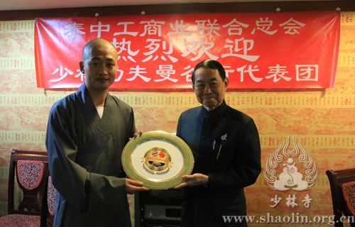 2月18日中午十二点,泰中工商业联合总主席侧塔·塔纳扎罗上将(泰国前副总理、前国防部长、前陆军总司令),于泰国曼谷洲际酒店,设宴欢迎少林文化代表团一行。出席宴会的泰方嘉宾有:泰中工商业联合总会执行主席林伟、执行副主席尚延明、副主席王雪中、副主席陈建平、秘书长巴立·汶革上将、副秘书长颂汶·诗蒙他中将、副秘书长梭拉猜·缴诺少将、副秘书长叶碧英、副秘书长林奋腾、副秘书长吉迪蓬·塔那森瑞、副秘书长蓬沙·利沙蒙、副秘书长允欲通·帕迪侬空警中将,会董余佳丽(春秋航空泰国总经理),以及其他会董等,共计40余人。
