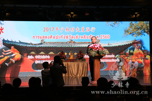 晚上六点半,泰中两国国歌在会场先后奏响,随后,泰中工商业联合总主席侧塔上将向前来泰国进行文化交流的少林功夫曼谷行代表团一行致欢迎辞,泰中工商业联合总会执行主席林伟向来宾介绍本次活动筹备情况,泰国副总理巴真致辞,并宣布“2017年少林功夫曼谷行”正式开幕。