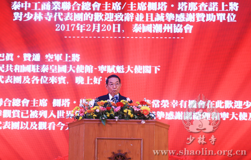 晚上六点半,泰中两国国歌在会场先后奏响。欢迎晚会上,泰中工商业联合总主席侧塔上将对少林功夫曼谷行代表团一行的到来表示了热烈欢迎,他在致辞中讲到:“一直以来,泰国民众希望对喜爱的少林寺、少林功夫有更多的了解,少林文化代表团的到来,满足了泰国民众的愿望。泰国人民欢迎少林文化代表团的到来,希望中泰两国人民能够友谊长存,亲如一家。”