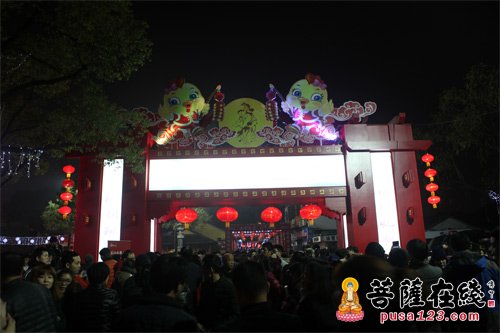 花灯初上,寒山寺内外张灯结彩,绚丽迷人,人头攒动,笑脸盈盈,一派祥和喜庆。寒山寺东门广场上敲响了欢快的锣鼓,身穿戏服脚踩高跷的民间艺人带来了喜庆的舞蹈。两只憨态可掬的大公鸡人偶来回穿梭于熙熙攘攘的人群,引得游人忍不住走上前去合影,留下美好的瞬间。