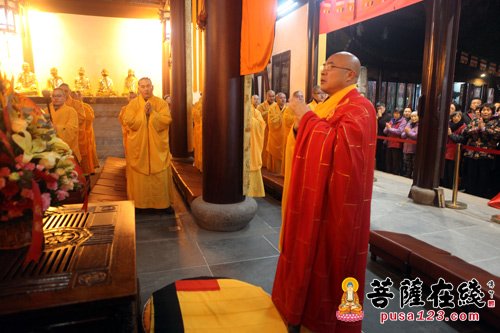 23时28分,秋爽大和尚致辞,代表寒山寺两序大众向各位嘉宾及社会贤达表示热烈欢迎!向关心、支持寒山寺的各位领导和信众表示衷心感谢!他说钟声象征和平,象征和谐,象征平安!佛经云:“闻钟声,烦恼轻,智慧长,菩提增”。愿这辞旧迎新的一百零八响寒山钟声传遍苏州,响彻中华大地,愿佛陀的智慧之光照耀世界的每一个角落。