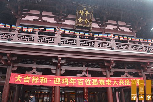 2017年1月7日上午(农历十二月初十),鸡年春节来临之际。寒山寺与和合文化基金会,携手苏州姑苏区“手拉手”爱心援助中心举办“大吉祥和,迎鸡年百位孤孤寡老人度新春活动”,100位孤老在志愿者的陪伴下,陆续到达寒山寺和合精舍,参加共度新春活动,每位老人脸上都洋溢着幸福满足的笑容。