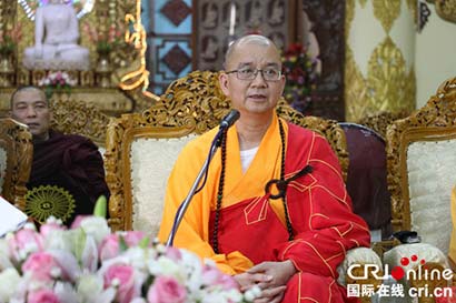 缅甸高僧委员会主席巴丹那固玛亚壁文达博士在祈福法会上致辞(图片来源:国际在线 摄影:洪荃诠)