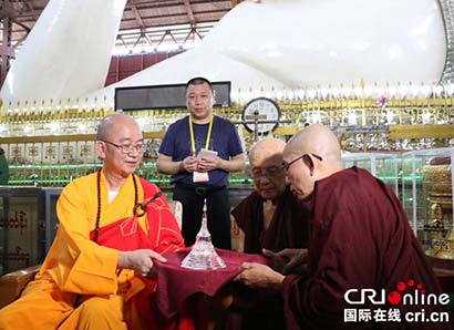 学诚法师将大金塔水晶模型送还巧塔基卧佛寺大长老(图片来源:国际在线 摄影:洪荃诠)