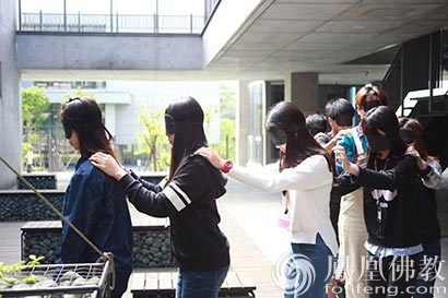 同学们先在义工陪伴下,尝试体验视障者如何在黑暗中行走。