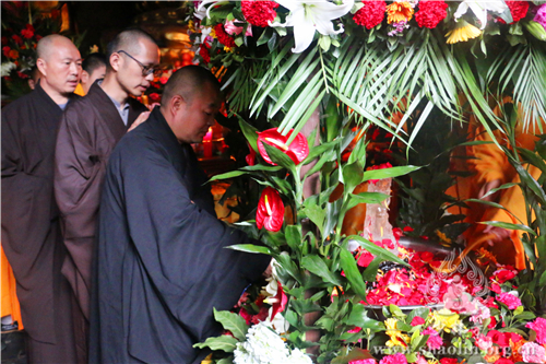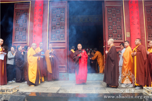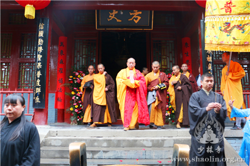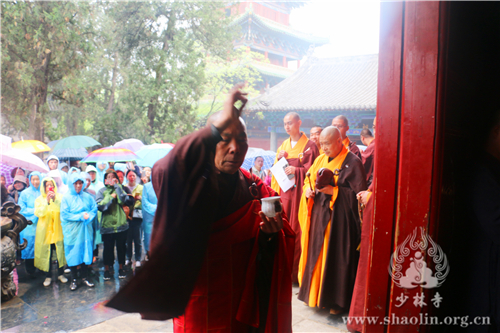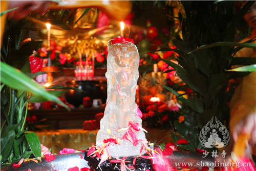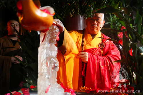 上午9时30分,天降甘霖,普润群机,龙天欢喜。在庄严的仪仗中,少林寺僧众缓行至方丈室,迎请释永信方丈。随后,香花开道,永信方丈护持水晶释迦太子像至大雄宝殿。殿内香花灯烛、梵呗缭绕,香花丛中放置铜盆,盆中香汤由旃檀、紫檀、郁金、龙脑、沉香、麝香、丁香等配制而成。在大雄宝殿,永信方丈将水晶太子像立于铜盆之中,法相庄严。