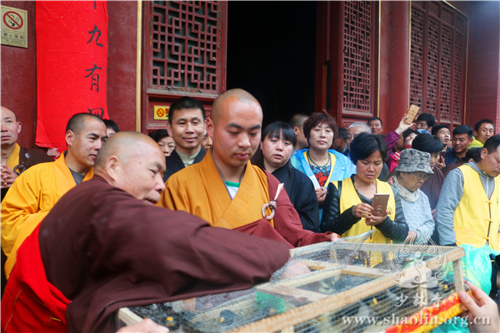 浴佛法会结束后,一场庄严殊胜的放生祈福法会在少林寺大雄宝殿前举行。少林寺首座永乾法师拈香主法,并带领少林寺僧众及护法居士为本次放生的生物说三皈依法,诵大悲咒、往生咒加持,祈愿放生的生物能永离三途。