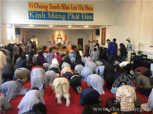 上午十点半,英国少林修文化中心负责人延修与当地400余名华人华侨及善信齐聚佛堂,一起诵经礼佛,庄严殊胜。期间,法师为善信做慈悲开示,讲述佛陀诞生的故事及他的一生功德,众人欢喜赞叹,誓愿发心追寻佛陀的足迹,勇猛精进,弘扬佛法。