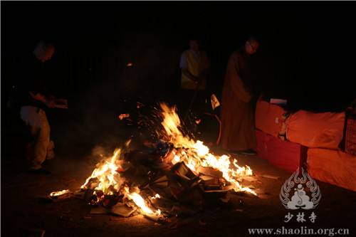 唱毕,仪仗队行至少林寺地藏殿,唱诵《回向偈》。随后,斋主礼谢,焰口仪式结束。整场法会庄严如法,僧众威仪庠序,善信各得法喜,历时五个小时后,法会功德圆满。(文/图 邹相 王海涛 张新伟 王鸿)