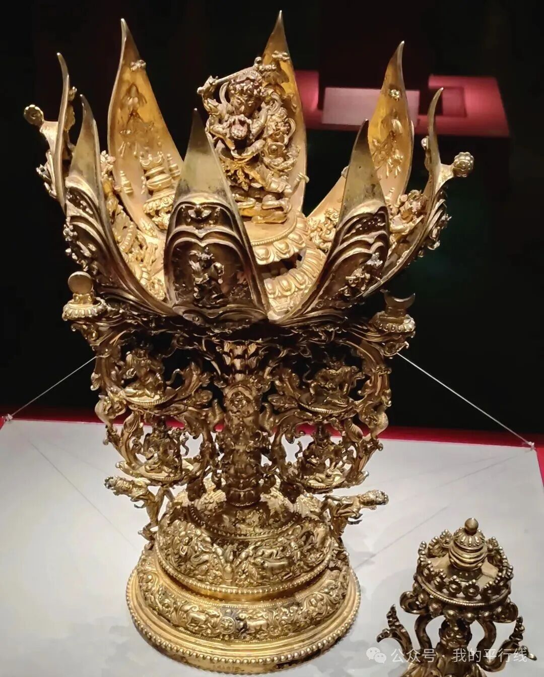 永乐年间(1403–1424年)鎏金铜红大威德金刚莲花曼荼罗,描绘大威德金刚(Yamantaka)及其伴侣,置于八瓣莲花中,伴以象征觉醒与纯净的摩尼宝珠,工艺精湛、寓意深刻。